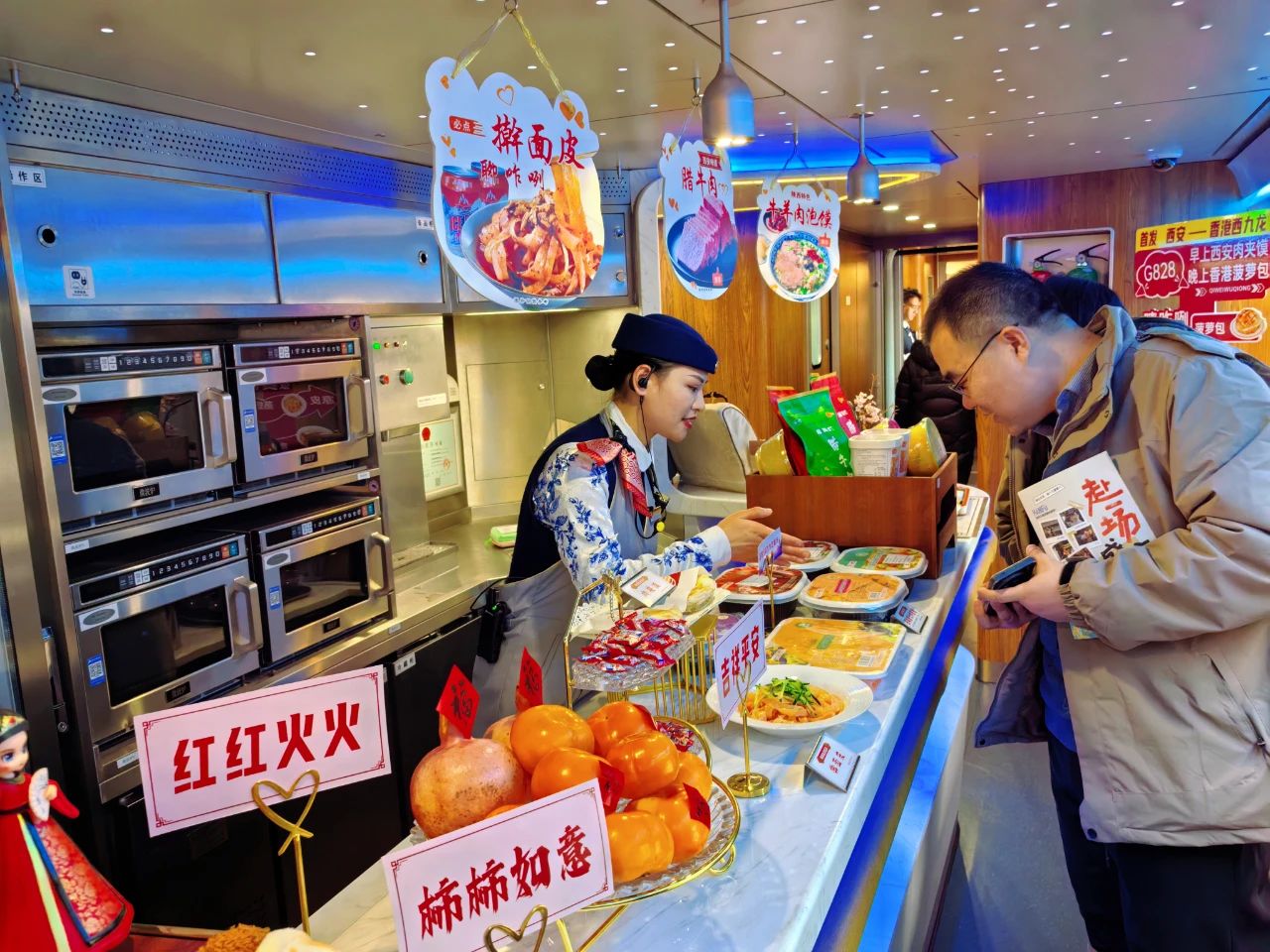 G828次列車餐吧內(nèi),旅客不僅可以享受到各種口味的平價(jià)營(yíng)養(yǎng)套餐、便捷商務(wù)快餐、健康素食快餐、特色清真餐、及陜西特色的美食“肉夾饃、涼皮、羊肉泡饃、臘牛肉”等,還特別增設(shè)了避風(fēng)塘大蝦等經(jīng)典港式風(fēng)味快餐,既保留了陜西的傳統(tǒng)風(fēng)味,又融入了香港的多元文化。當(dāng)陜西肉夾饃的醇厚與避風(fēng)塘大蝦的鮮香相互交織,為旅客們帶來一場(chǎng)跨越千里的味蕾盛宴。每一道佳肴,都承載著兩地深厚的文化底蘊(yùn),傳遞著家的溫馨和關(guān)懷。此外,宜路行公司對(duì)G828次列車上的零食、飲品也做了品質(zhì)升級(jí),配備了豐富的港式零食、咖啡奶茶、飲品、及日用百貨等,以滿足旅客的多樣化需求。