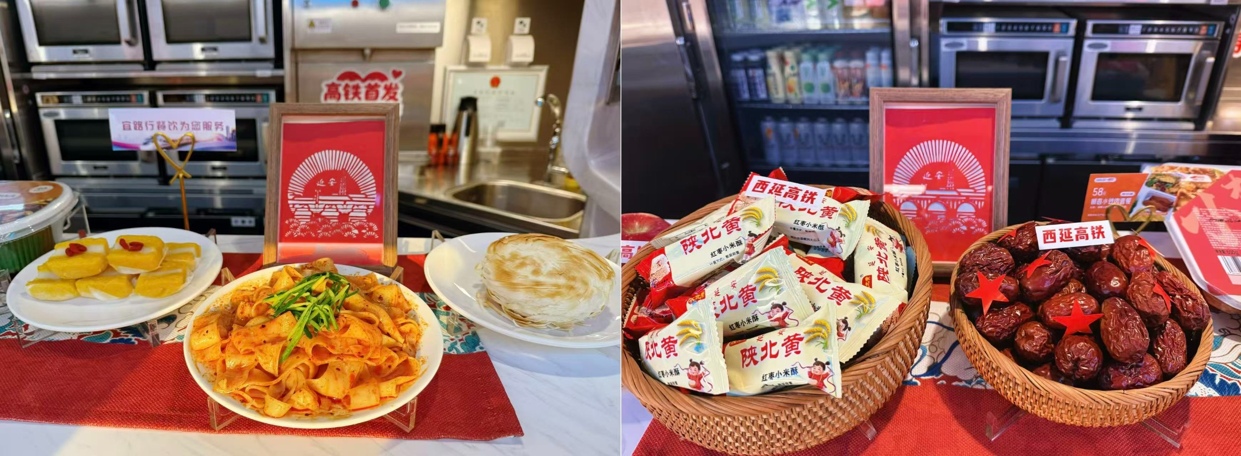 為了讓旅客全方位“品味延安”,餐吧特別設(shè)置了“延安味道”體驗角,旅客可以品嘗到小米涼糕、洛川蘋果、小米酥、陜北紅棗等非遺特色小吃,讓味蕾在飛馳的列車上“游延安”,感受地道的黃土高原風(fēng)味。
